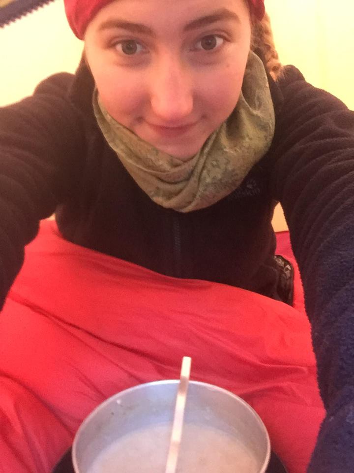 E reja ka fjetur dy netë në tendën e saj, natën e parë poshtë një lumi të vogël dhe natën e dytë në dëborë. Temperatura ishte nën 12 gradë sakaq shton për Pozitivin se një natë është ngritur e mbuluar me akull në çantën ku flinte. Por edhe për këtë tregon se e ka gjetur zgjidhjen.